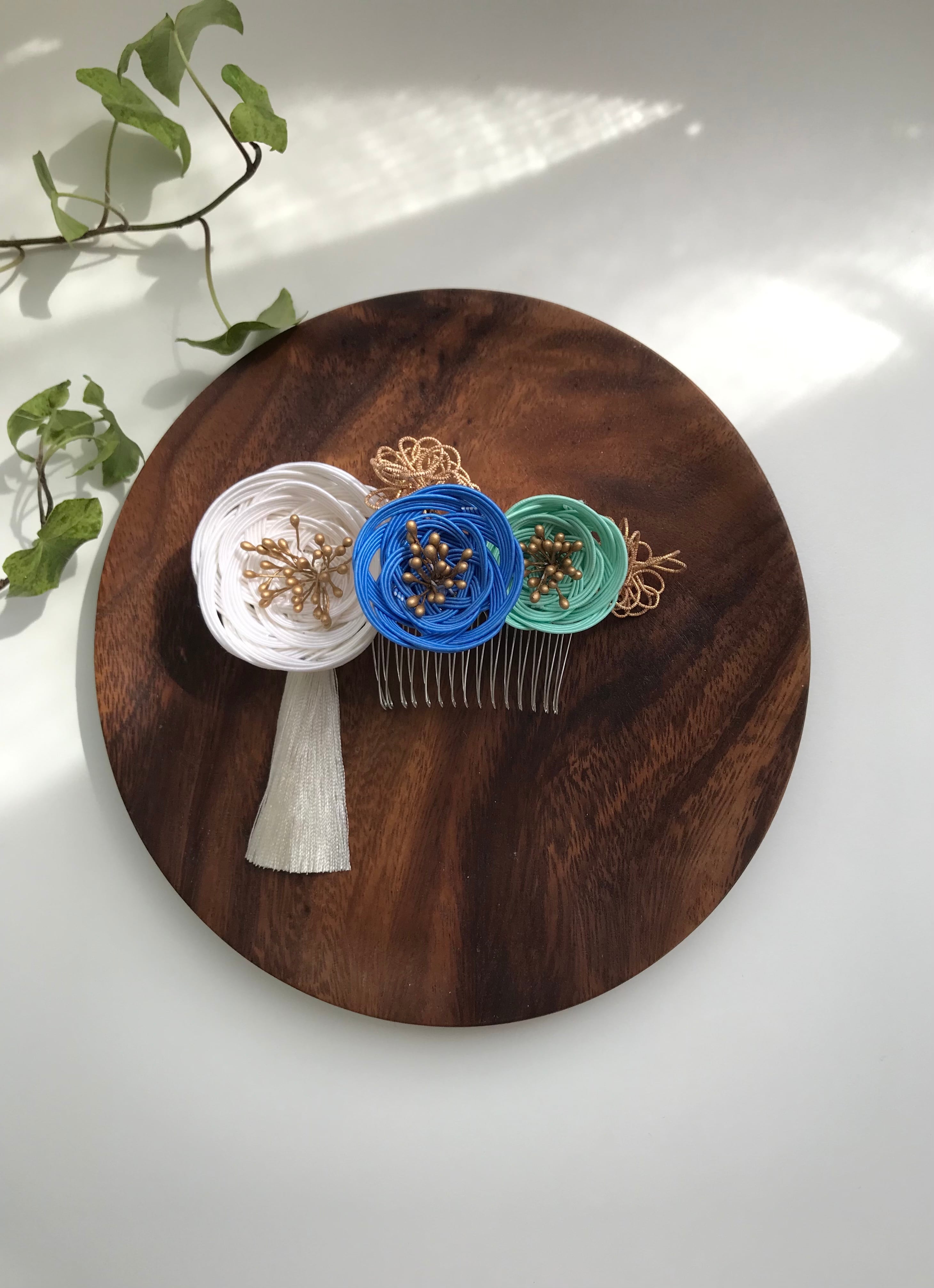 こちら写真では白のお作りしておりますが、お色はお着物やお洋服、ご自身のパーソナルカラーに合わせて38色の中から5色まで、お選びいただくことができるセミオーダーの髪飾りです。